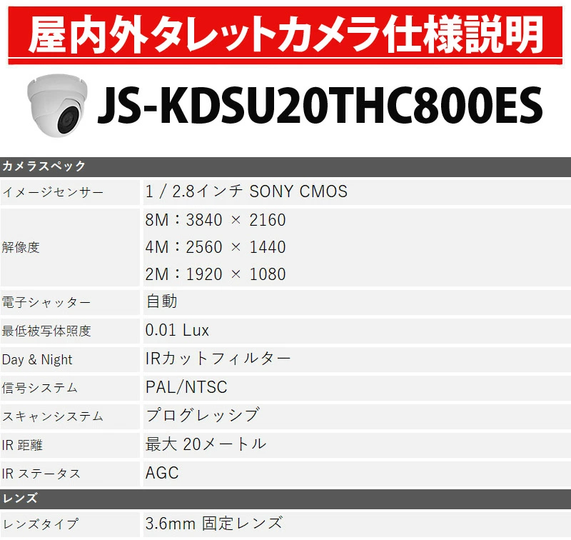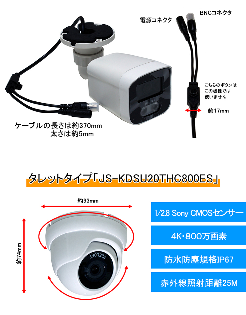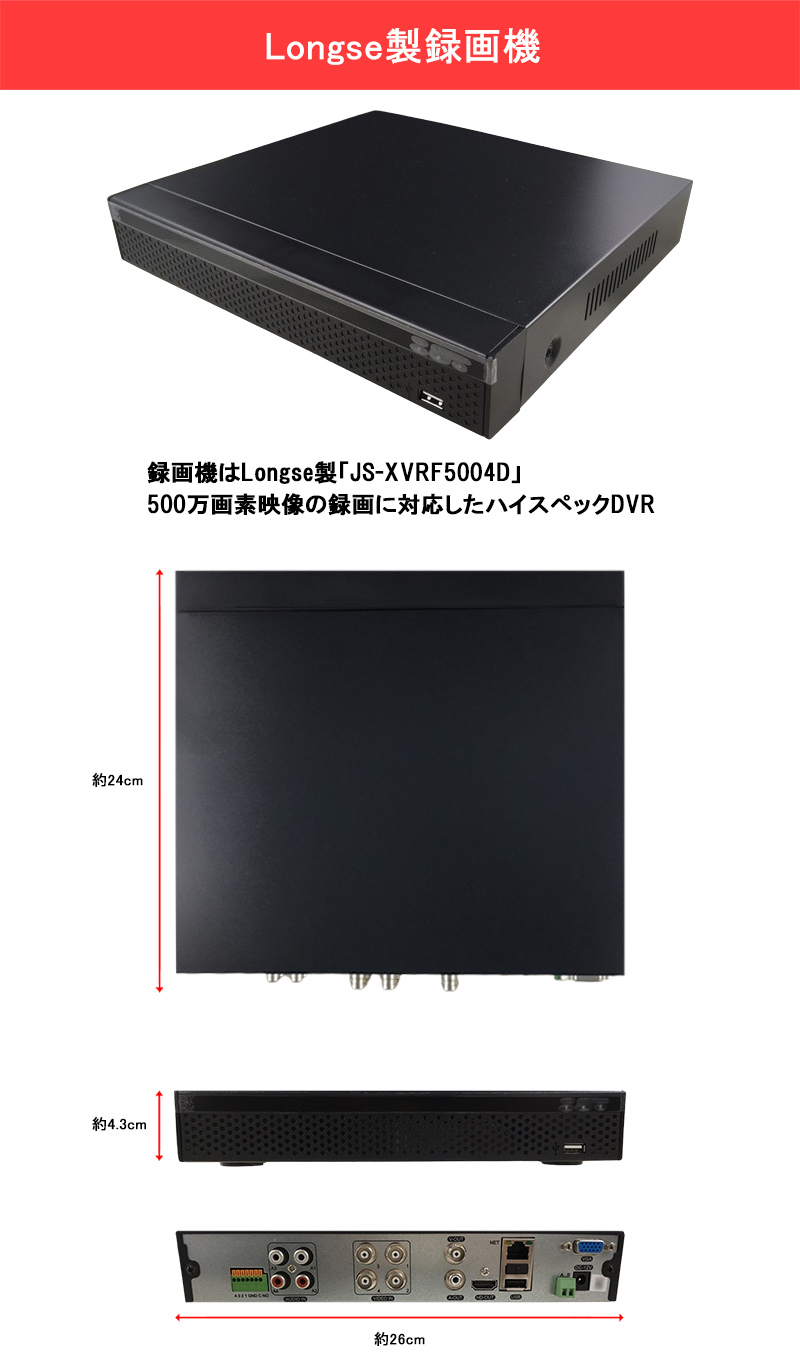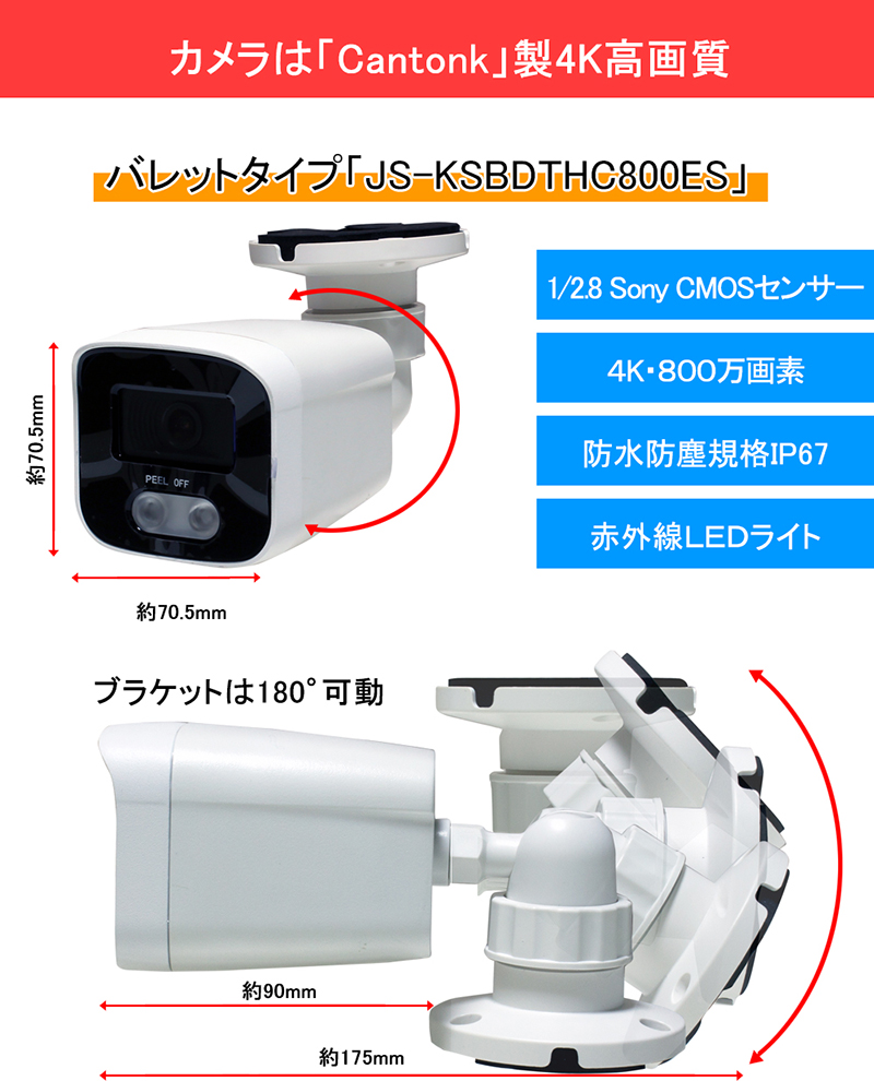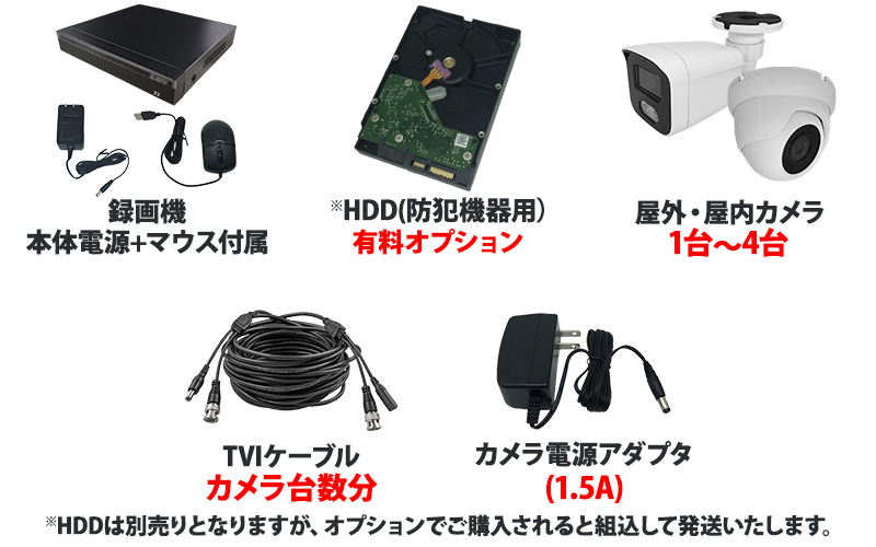 防犯カメラセット 4K アナログ 屋内屋外カメラ1~4台 レコーダーHDD別 4chDVR スマホ監視 4K-SETJS-4CH-TS